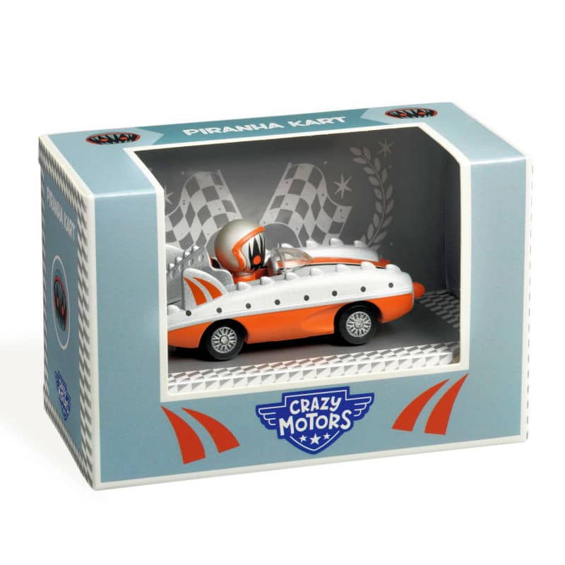 Découvrez Piranha Kart de la collection Crazy Motors de Djeco, une voiture de course en métal avec son pilote de course. Un jouet pour les enfants de 3 à 9 ans.