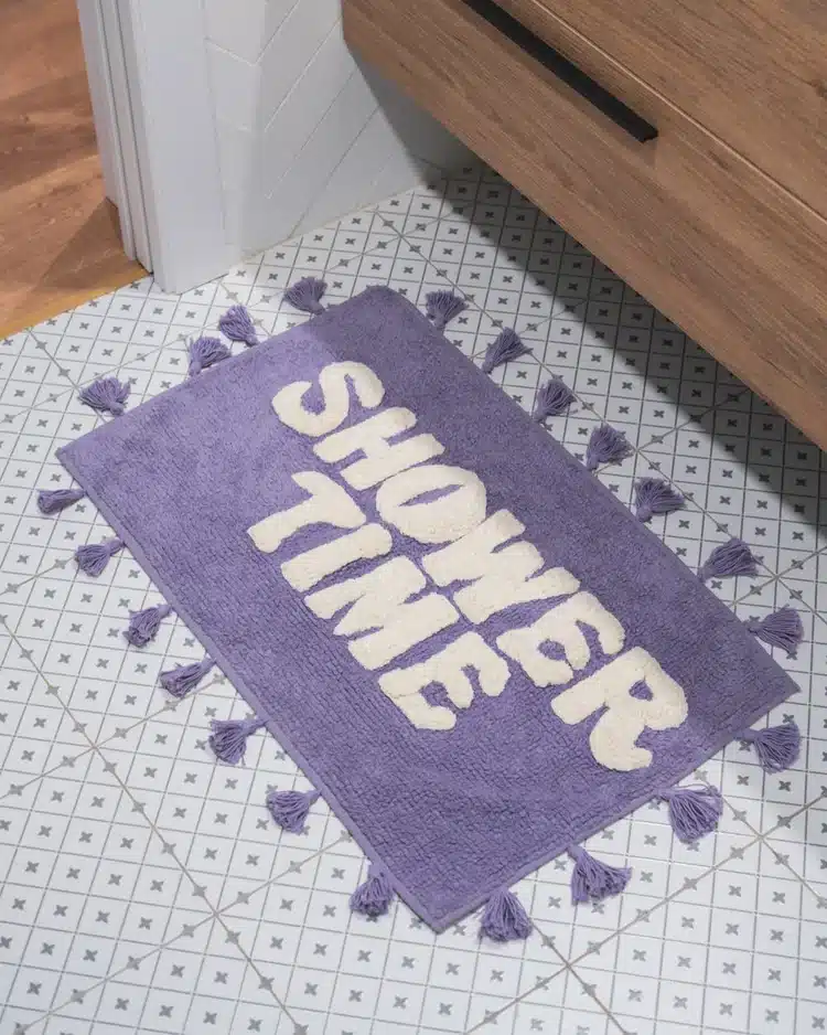 Le tapis de bain violet « Shower Time » est 100 % coton avec un envers antidérapant. Complétez votre décoration de salle de bain avec un tapis doux et amusant !